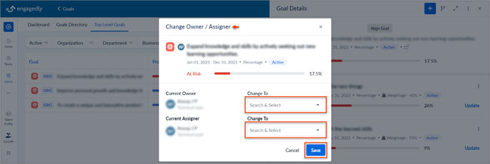 - Select the Top Level Goal you want to change the owner and assigner, click the Overflow